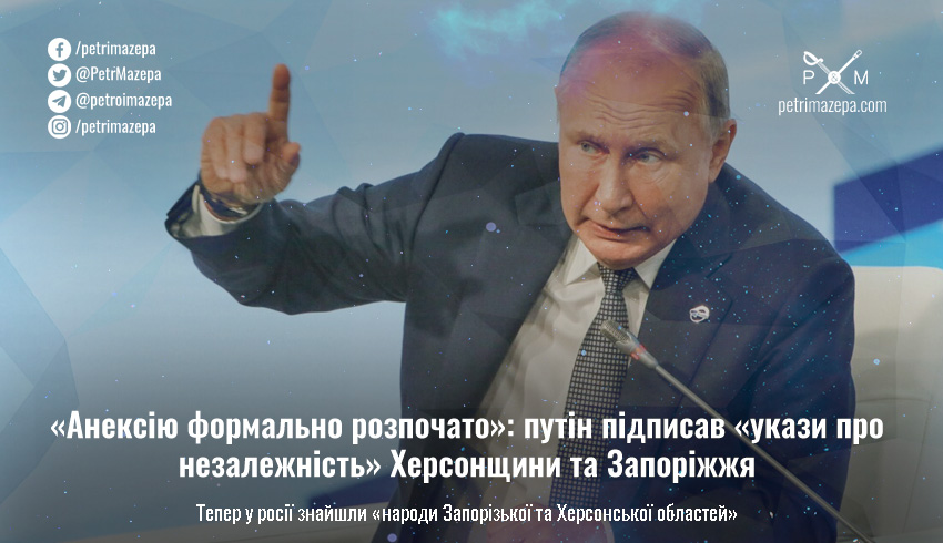 Путин підписав укази про «визнання суверенітету та незалежності» двох областей України — Запорізької та Херсонської областей України. Причому в тексті цих «документів» він визнає, що росія намагатиметься претендувати на всю територію двох областей сусідньої країни.