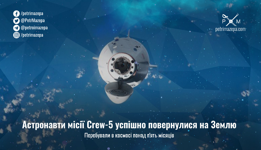 Четверо астронавтів місії Crew-5 успішно повернулися на Землю після того, як майже п'ять місяців (157 днів) перебували в космосі.