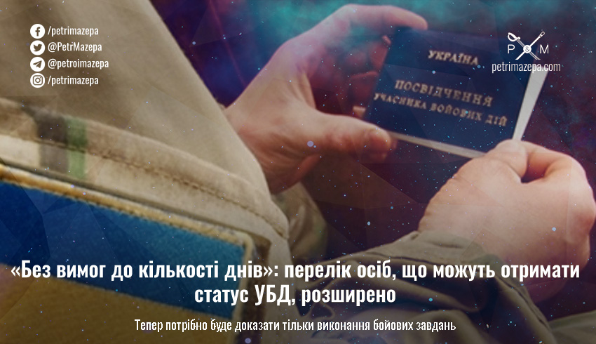 Кабінет міністрів України розширив перелік тих, хто має право на отримання статусу учасника бойових дій — урегульовано порядок та процедуру надання УБД громадянам, які стали на захист України після повномасштабного вторгнення росії.