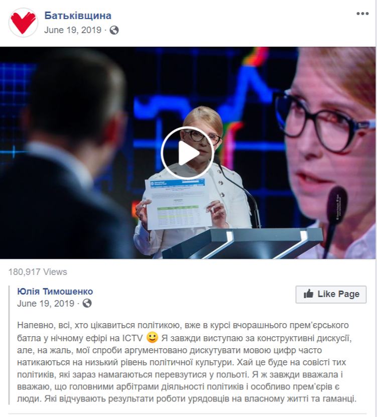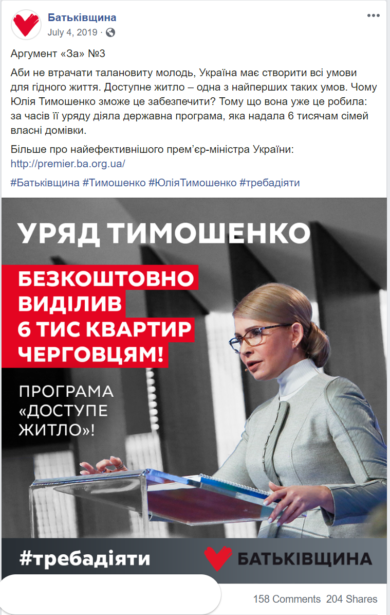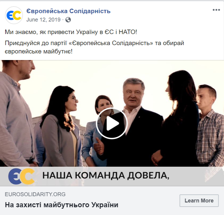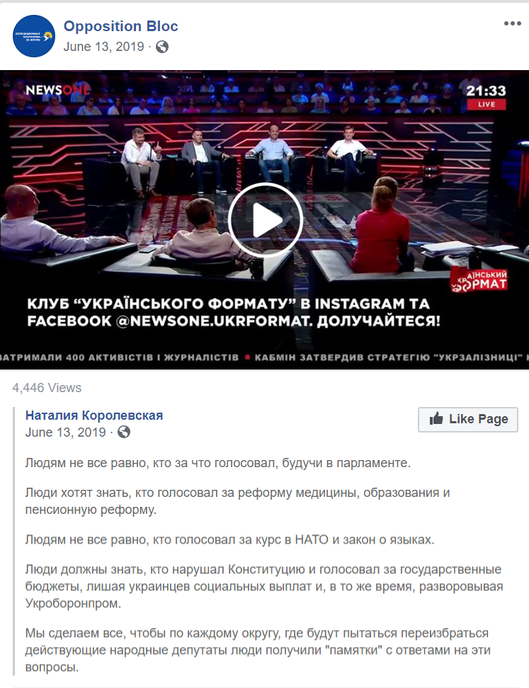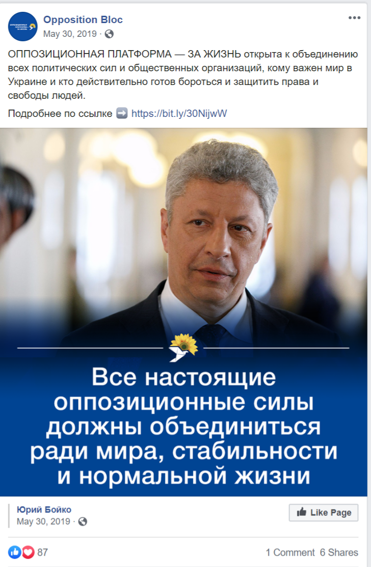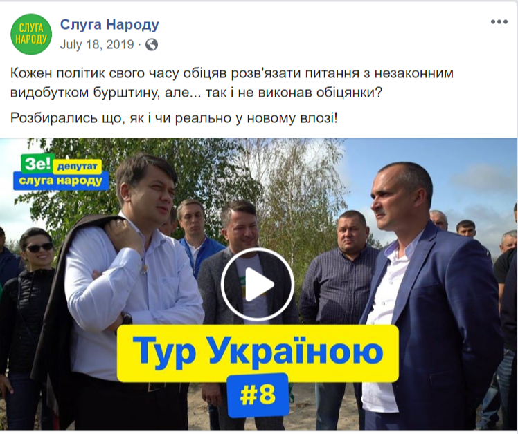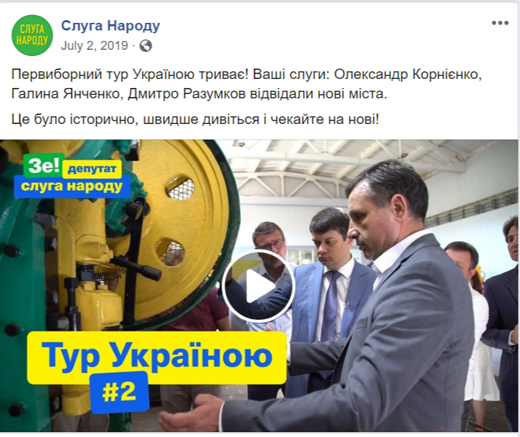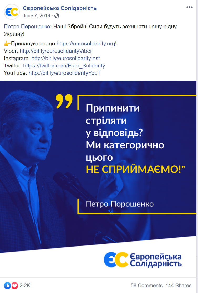Типовий «лідерський» контент, що поширюється в фейсбуку — фотографія голови чи першого номера виборчого списку плюс цитата з його виступу або програмних положень партії. Такі дописи не використовувала хіба що партія «Слуга народу».