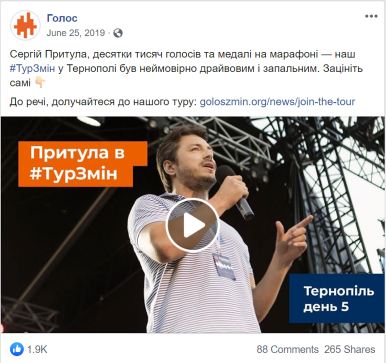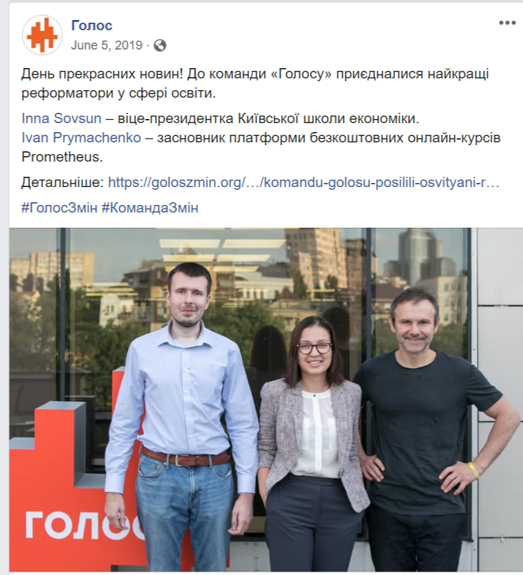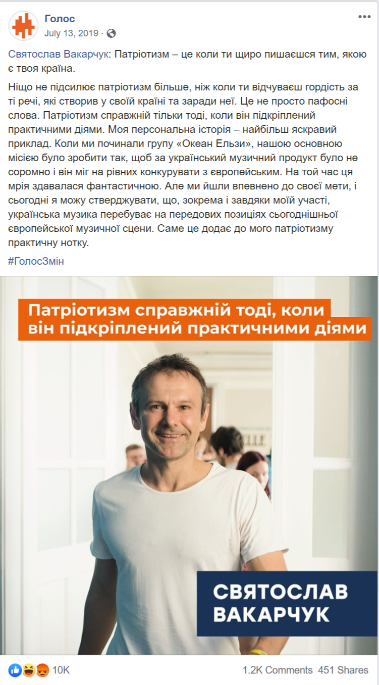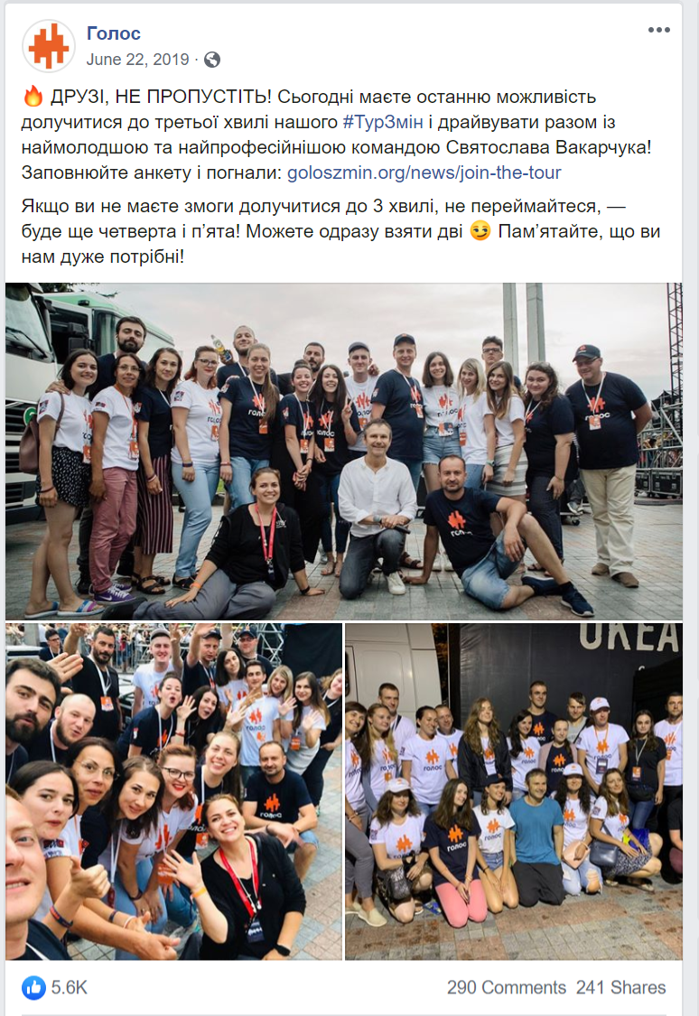 Натомість Святослав Вакарчук на фото, опублікованих офіційною сторінкою «Голосу», часто в компанії інших кандидатів із виборчого списку партії або волонтерів. І в дописах ідеться найчастіше саме про партію, а не про її лідера.