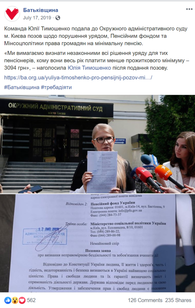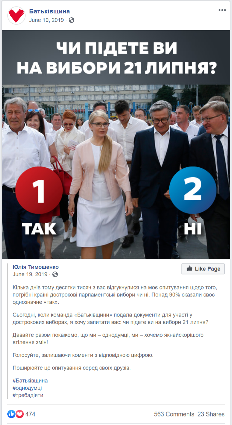 «Батьківщина» переважно перепощувала на своїх офіційних сторінках матеріали зі сторінки Юлії Тимошенко. Прикметно, що на фото Юлія Тимошенко завжди в центрі й зазвичай сама, а не з іншими членами партії або кандидатами зі списку.