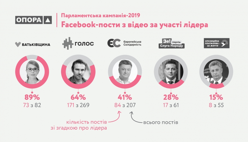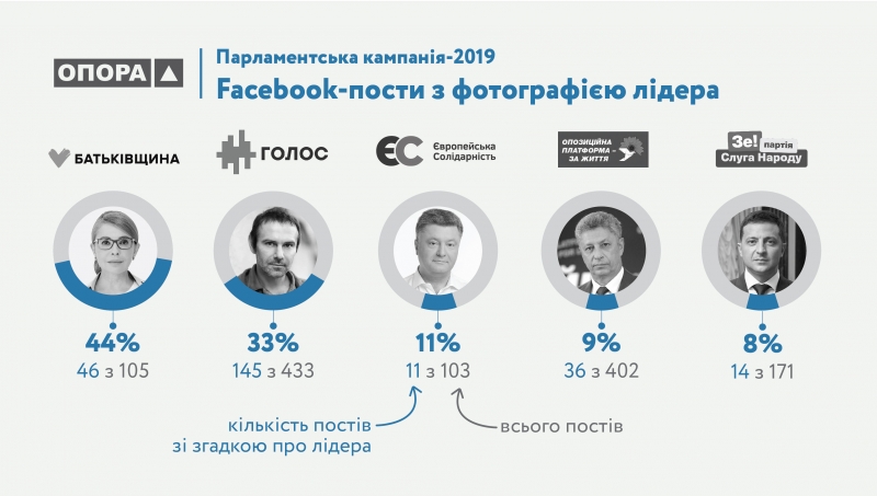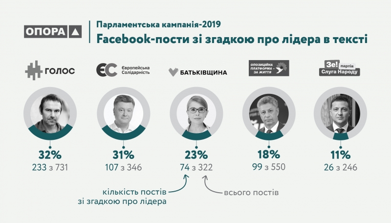 Чи збереглася ця тенденція у 2019 році? Аби з’ясувати це, дослідники ОПОРИ проаналізували офіційні фейсбук-сторінки п’яти політичних сил, які врешті потрапили до парламенту: «Слуги народу», «Опозиційної платформи — За життя», «Батьківщини», «Європейської солідарності» та «Голосу». Загалом 2,2 тисячі дописів, із них майже 500 — зі згадками про лідерів.