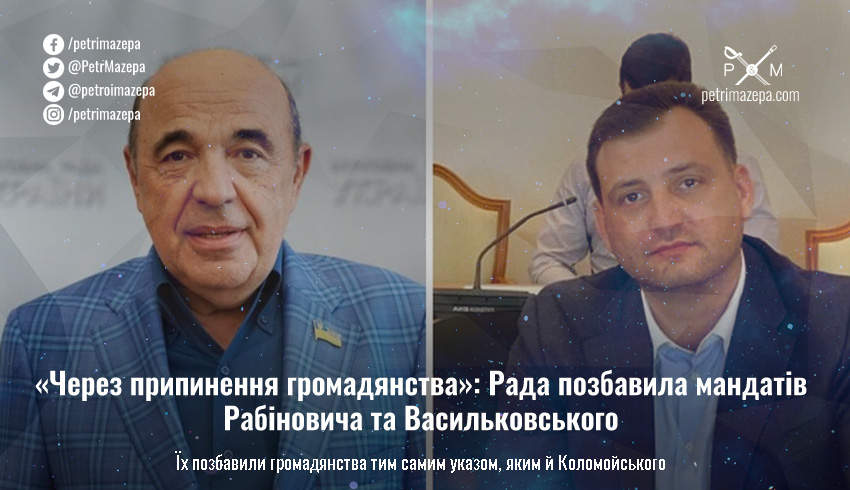 Сьогодні Верховна Рада підтримала дострокове припинення повноважень депутатів Вадима Рабіновича з «ОПЗЖ» та Ігоря Васильковського з «Слуги народу» у зв’язку з позбавленням громадянства України.