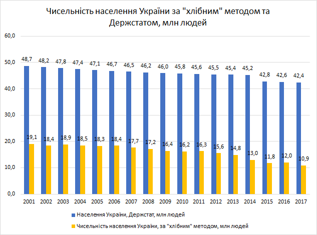 Але за 2001 рік є набагато достовірніші дані про чисельність населення. Тоді був проведений останній перепис населення, згідно з яким українців налічувалося в країні 48,5 млн. Тобто чисельність населення за обсягами споживання хліба занижена у 2,5 рази — принаймні на 2001 рік.