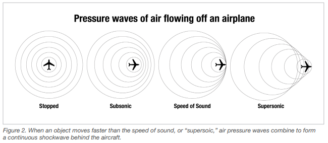 Отже, коли літальний апарат переміщається в повітрі, навколо нього поширюються звукові хвилі. Доки його швидкість менша від швидкості звуку (число Маха М<<1) це ніяк не впливає на аеродинаміку. Але коли швидкість ЛА починає наближатися до швидкості звуку (М~1), виникають цікаві моменти. Газ вже не встигає передати звукову хвилю, і вони ніби починають доганяти одна одну. При досягненні швидкості звуку повітря вже не встигає «розступатися», і при обтіканні літального апарату утворюються так звані стрибки ущільнення, які ще називають ударними хвилями. Цей процес показано на класичних ілюстраціях різних швидкостей польоту літака.