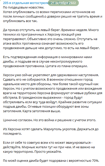 «Є підтверджена інформація про мінування нами дамби, і підрив її в разі неконтрольованого просування противника. Цитата з плану операції», — дотепер повідомляється у каналі 205-ї окремої мотострілецької бригади ворога у Telegram, у повідомленні від 21 жовтня 2022 року. Там же можна побачити й рекомендації, як поводитися при затопленні, й навіть зону затоплення.