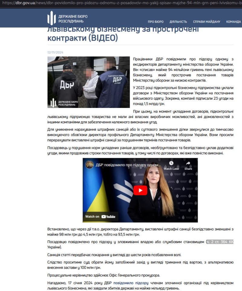 ДБР: Ексчиновник Міноборони «списав» фірмам Гринкевича 94 мільйони гривень пені