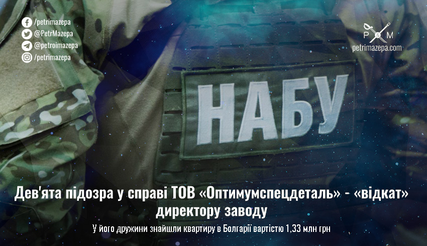Національне антикорупційне бюро у вівторок, 25 жовтня, повідомило про підозру дев'ятому фігуранту кримінального провадження, пов'язаного з махінаціями ТОВ «Оптимумспецдеталь». Ним став директор державного приладобудівного заводу, що входить до складу концерну Укроборонпром.