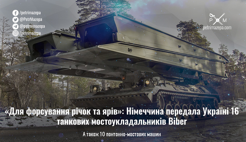 Німеччина передала Україні 16 танкових мостоукладальників Biber — машин, призначених для забезпечення подолання танками та іншою бронетехнікою річок та протитанкових укріплень. Про це повідомляє «Інтерфакс-Україна» із посиланням на дані федерального уряду Німеччини.