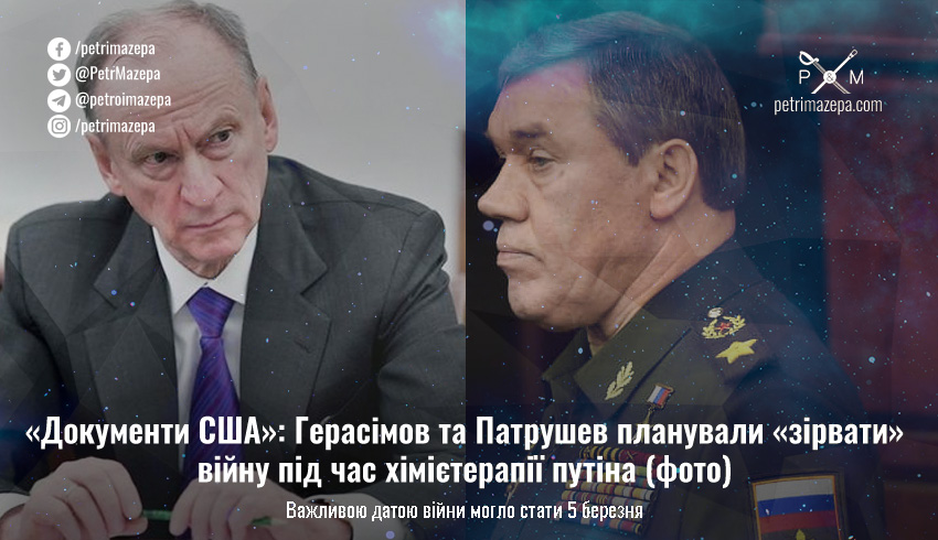 Герасімов та Патрушев могли бути частиною змови і планували «зірвати» війну росії проти України до 5 березня — коли путін через хіміотерапію не зміг би протистояти їхнім планам. Про це повідомляється у «документах Пентагону», фото тексту з яких оприлюднило видання Daily Mail.