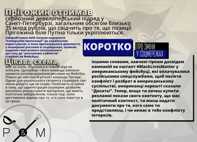 Тепер, якщо ти хочеш купити рекламні покази свого контенту, що має політичний контекст, маєш надати документи про те, кого саме ти представляєш, і чи немає в тебе конфлікту інтересів. Однак навряд чи це стало причиною купівлі «прігожинськими» послуг із просування свого контенту. Справа в тому, що для ефективного розголосу потрібні вже існуючі «не замарані» джерела, що мають певний потенціал резонансу. Немає сенсу витрачати гроші на їх створення, якщо якесь регіональне медіа за гроші просто надасть свою платформу для розміщення антиукраїнської джинси про «зраду» і відкриє двері у рекламний кабінет на Фейсбуці, щоб її розігнати.