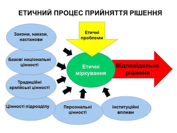 Основними чинниками або силами, що впливатимуть на адекватність до ситуації етичного процесу прийняття рішення військовим лідером, будуть такі:
