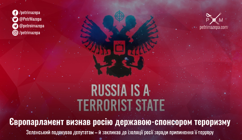 Європарламент визнав росію державою-спонсором тероризму та державою, яка використовує засоби тероризму. Парламентарії визнали, що росія здійснює невибіркові атаки на критичну інфраструктуру, страти без суду та слідства, викрадення, зґвалтування та інші звірства.