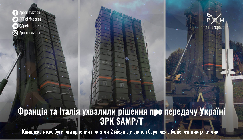 Франція та Італія ухвалили рішення про відправлення в Україну зенітного ракетного комплексу (ЗРК) SAMP/T. Раніше італійська сторона прогнозувала, що цей комплекс може бути розгорнутий в Україні протягом 2 місяців. Серед іншого, комплекс також здатний боротися з балістичними ракетами.