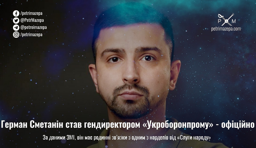 Міністерство з питань стратегічних галузей промисловості України (Мінстратегпром) повідомило, що сьогодні набрало чинності розпорядження Кабміну, яким Германа Сметаніна призначено новим керівником АО «Українська оборонна промисловість» (Укроборонпром).