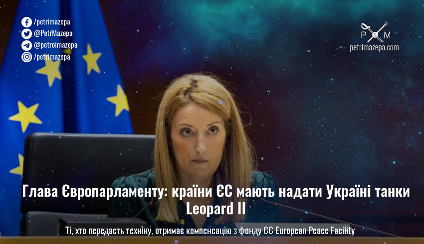 «Українцям потрібна зброя, якою вони можуть воювати, щоб повернути свою територію, і це означає, наприклад, танки Leopard II, які мають кілька держав-членів», — заявила глава Європейського парламенту, передає France24.