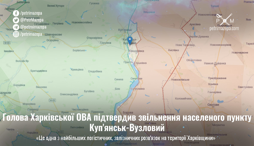 Голова Харківської обласної військової адміністрації Олег Синєгубов підтвердив звільнення від російських окупантів населеного пункту Куп'янськ-Вузловий.