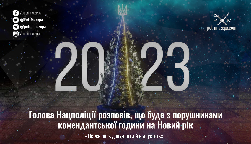 - 26 грудня у Нацполіції повідомили, що у новорічну ніч комендантська година в Україні не буде скасована, поліція буде перевіряти документи та затримувати порушників.