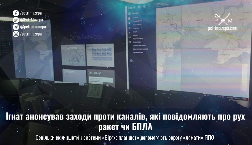 Ігнат наголосив, що деякі Telegram-канали в режимі реального часу подають інформацію про рух БПЛА чи ракет. І використовують скриншоти з системи «Віраж-планшет». На цих скриншотах вказується час та місце перебування об’єктів та їх зникнення з радарів. Все це допомагає ворогу обходити наші засоби застереження та ламати систему ППО. Таку інформацію росія враховує при плануванні наступних ракетних атак, додає NV.