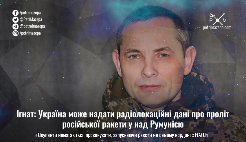 Речник Повітряних сил Збройних сил України Юрій Ігнат запевнив, що є радіолокаційні дані, які підтверджують проліт випущених російськими окупантами ракет у повітряному просторі Румунії. Й додав, що цю інформацію може бути надано.