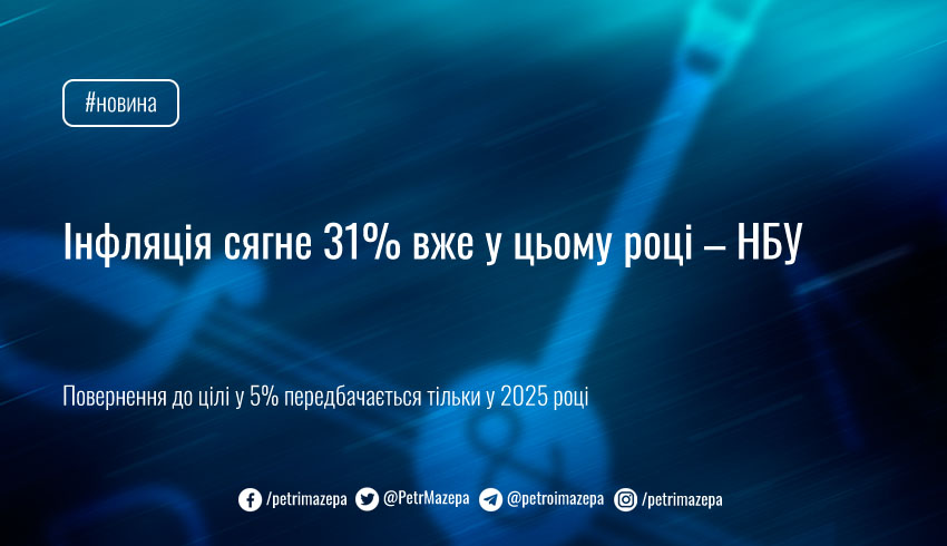 До кінця цього року інфляція в Україні прискорюватиметься й сягне 31%. Знижуватиметься вона почне тільки у 1 кварталі 2023 року, а повернення до цільової інфляції у 5% передбачається тільки у 2025 році.