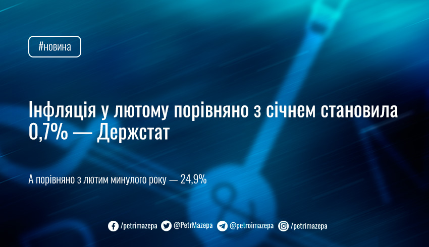 Інфляція у лютому порівняно з січнем становила 0,7%, з початку року — 1,5%. Базова інфляція у лютому щодо січня була на рівні 0,5%, з початку року — 1,2%.