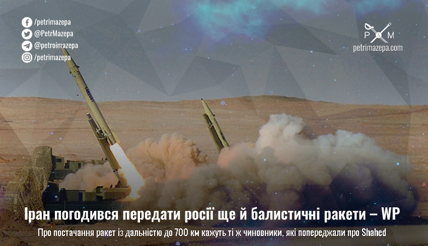 Тегеран ще 18 вересня відправив до росії своїх офіційних представників для того, щоб остаточно затвердити умови постачання зброї, в тому числі двох типів ракет класу «земля-земля». За оцінкою розвідки, якою вона нещодавно поділилась із владою як США, так і України, Іран готує першу партію балістичних ракет Fateh-110 із дальністю 300 км та Zolfaghar, здатних вражати цілі на відстані до 700 км.