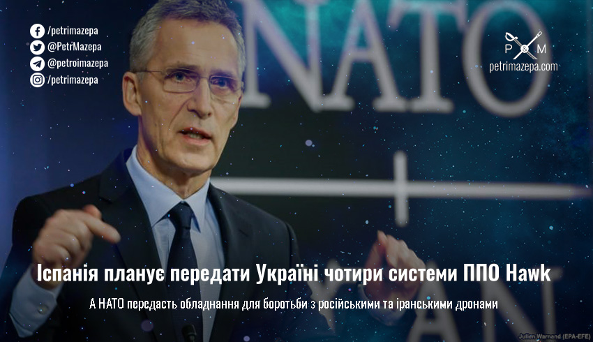 Іспанія має намір передати українським захисникам чотири системи ППО Hawk у рамках військової допомоги. Також стало відомо, що НАТО передасть Україні обладнання для боротьби з російськими та іранськими дронами.