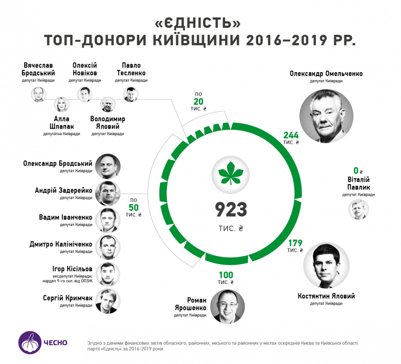Серед донорів-фізосіб є всі депутати Київради від «Єдності», окрім Віталія Павлика, який очолює Київську міську організацію партії «Єдність». Попри це, йому дісталося, імовірно, прохідне друге місце в загальному списку кандидатів до Київради на виборах-2020. Примітно те, що його неодноразово помічали за гречкосійством на користь виборців свого округу, а от на партбудівництво політик грошей пошкодував. Лідер партії Олександр Омельченко пожертвував найбільшу суму коштів.