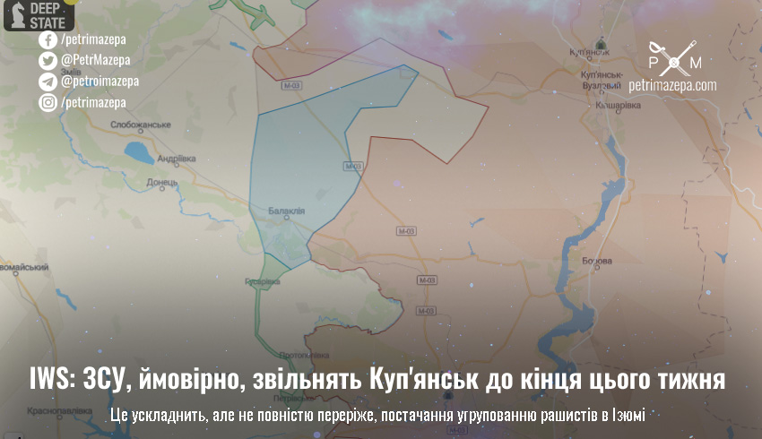 У нічному звіті Інститут вивчення війни (ISW) передбачає, що українські військові, найімовірніше, звільнять Куп'янськ у Харківській області протягом наступних 72 годин. Тобто до кінця цього тижня. Але коли це станеться, то постачання до ізюмського угруповання рашистів буде суттєво ускладнене.