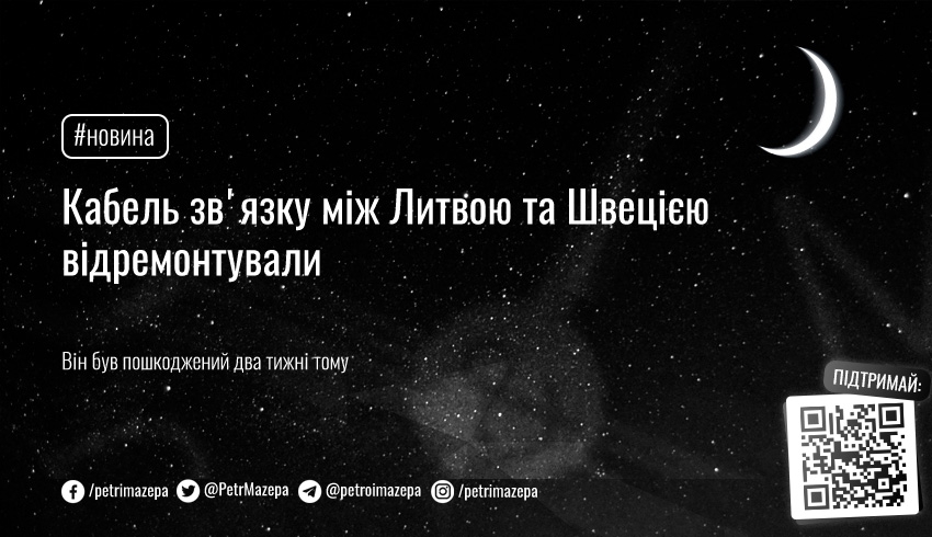 Кабель зв'язку між Литвою і Швецією в Балтійському морі, пошкоджений майже два тижні тому, відремонтували.