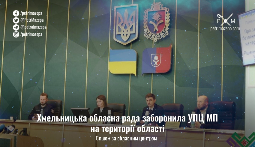 Депутати обласної ради одноголосно прийняли рішення «Про забезпечення зміцнення національної безпеки у сфері свободи совісті та діяльності релігійних організацій на території Хмельницької області», яким заборонили діяльність Української Православної Церкви Московського Патріархату (офіційно зареєстрована як Київська митрополія Української православної церкви) на території Хмельницької області, повідомляє пресслужба обласної ради.