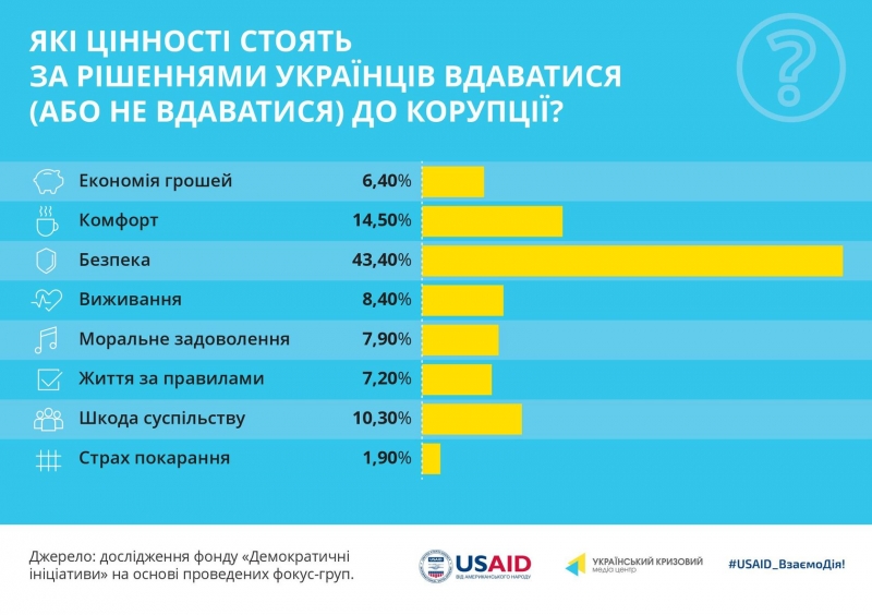 Ті тези, якими побутову корупцію виправдовують українці, відображені у так званій піраміді потреб Маслоу, і займають там другу ланку знизу. Це — цінності виживання. Більшість нашого населення, які живуть такими цінностями, мислять категоріями власної вигоди. Велика корупція у вищих органах влади працює тут як механізм виправдання власної жалюгідності. Немає сумнівів, що кожна причетна до корупції особа всередині себе чудового розуміє, що чинить погано.