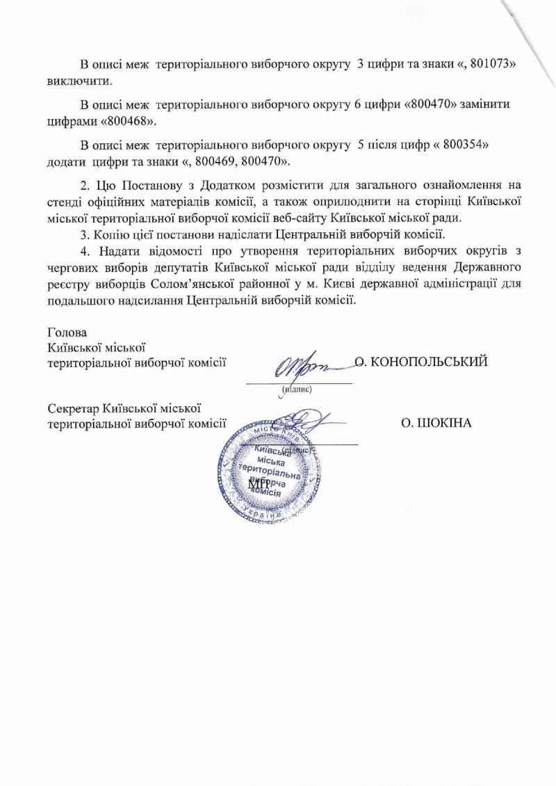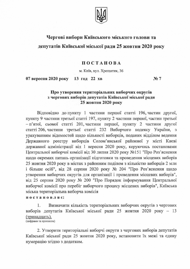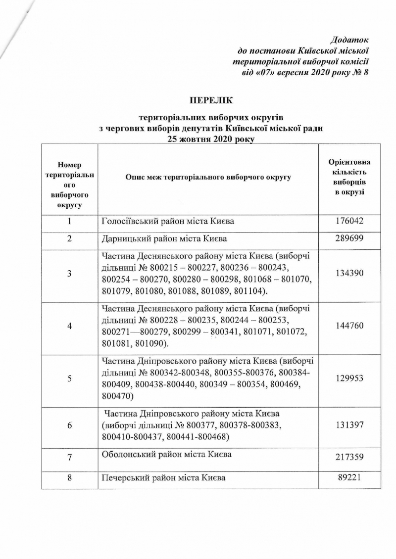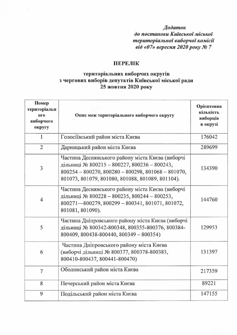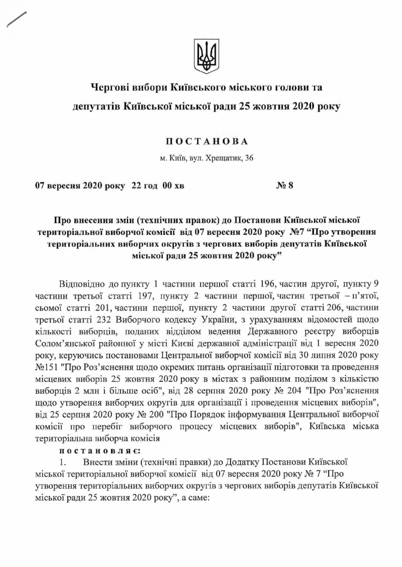 Так, 7 вересня, але вже о 22 годині, відбулося ще одне засідання Київської ТВК, присвячене внесенню «технічних правок» до Додатку Постанови від 07.09.2020 року №7 «Про утворення територіальних виборчих округів з чергових виборів депутатів Київської міської ради 25 жовтня 2020 року».