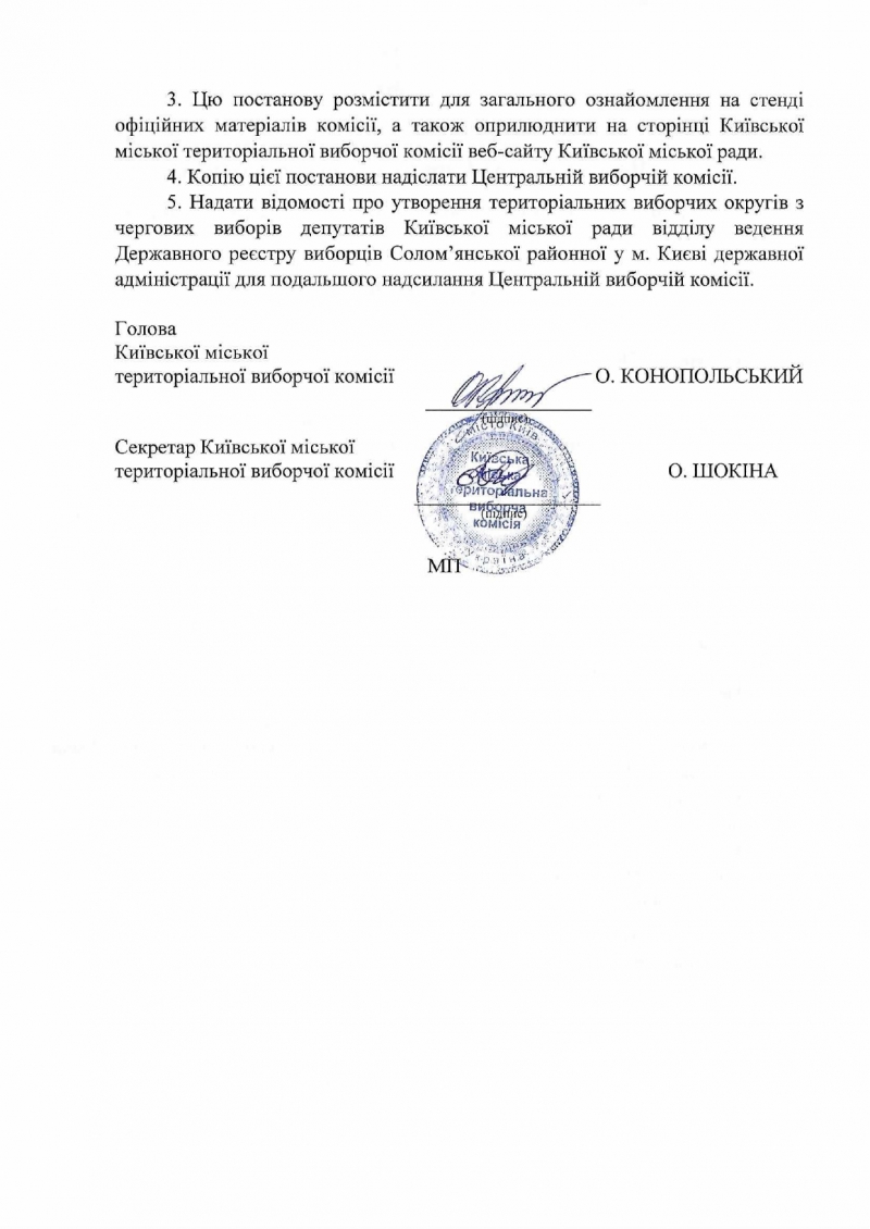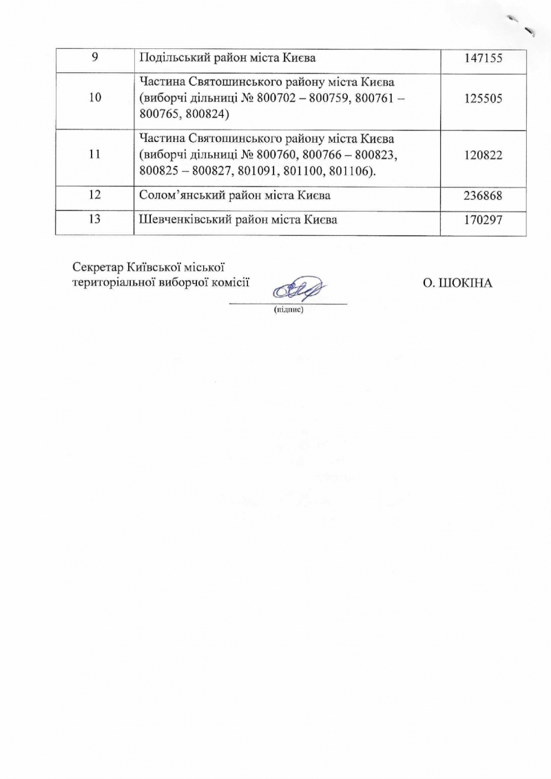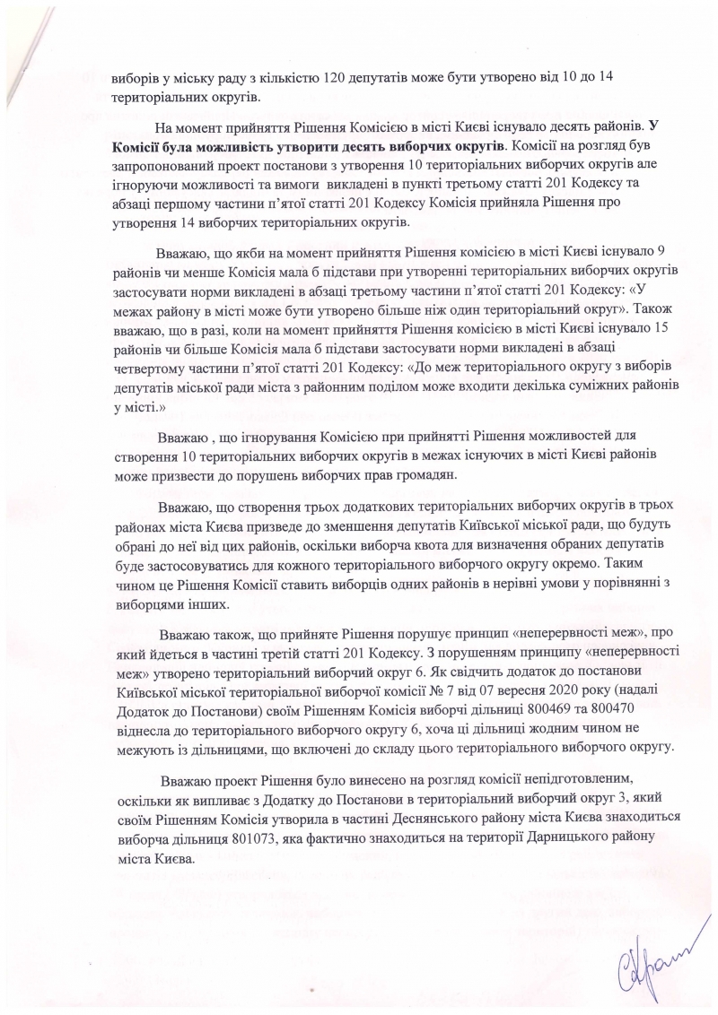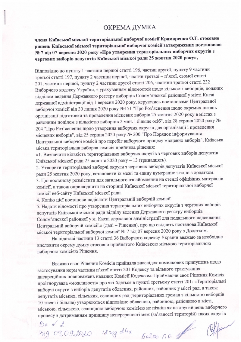 9 вересня о 12:42 член ТВК Олександр Крамаренко подав до Київської ТВК окрему думку, в якій висловив незгоду щодо Рішення Київської ТВК «Про утворення територіальних виборчих округів» у кількості 13 ТВО, зокрема, посилаючись на пункт 5 статті 201 Виборчого Кодексу та Роз'яснення ЦВК №204, пункту 3.3. «Утворення територіальних виборчих округів має здійснюватися з дотриманням принципу неперервності меж (зв’язності територій) таких округів та за можливості з урахуванням адміністративно-територіального устрою». На думку члена ТВК, рішення комісії порушує принцип неперервності меж, оскільки спеціальні виборчі дільниці №800469 та 800470 були віднесені до ТВО №6, а територіально мали бути віднесені до ТВО №5 (обидва у Дніпровському районі Києва, який ТВК своїм рішенням розділила на два виборчі округи). Відзначимо, що на вечірньому засіданні 7 вересня ці «технічні правки» були виправлені комісією. Олександр Крамаренко у свої окремій думці згадує порушення ТВК пункту 3 статті 201 Виборчого Кодексу, яка визначає крайні терміни утворення територіальних виборчих округів (не пізніше як на другий день виборчого процесу), хоча і прямо не зазначає, зосереджуючись на «врахуванні адміністративно-територіального устрою». Поза тим, відео зняте спостерігачами ОПОРИ, свідчить про порушення Київською ТВК строків утворення територіальних виборчих округів.