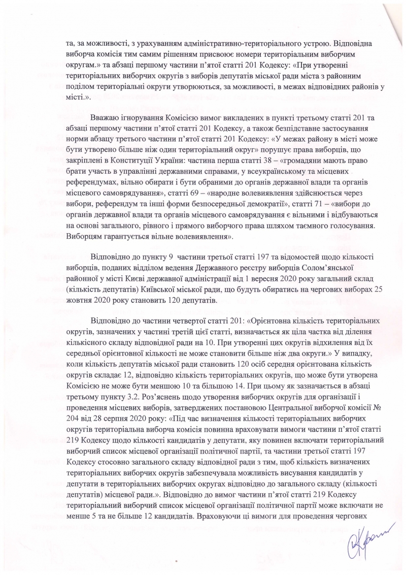 «Конфліктність процедури утворенням округів у місті Києві зумовлена багатьма факторами, перший із них недосконалість законодавства. Слід зазначити, що під час внесення змін до порівняльної таблиці до другого читання поправок, технічно було допущено помилку та зазначено посилання на неіснуючий 5 абзац частини 4 статті 201. Таким чином, як саме застосовувати і чи можна застосовувати «Перехідні положення», які пропонують особливий порядок утворення округів у місті Києві, є дискусійним з правової точки зору. ЦВК опинилася в складній ситуації, оскільки районні у місті виборчі комісії мали бути утворені нею в серпні, тоді як самі округи мали б формуватися іншою комісією — Київською міською ТВК. У роз’ясненні ЦВК від 30 липня 2020 року №151 зазначено, що застосувати норму Перехідних положень неможливо, територіальні виборчі округи з виборів міського голови існують згідно з вимогами Кодексу, та не потребують додаткового рішення територіальної виборчої комісії про їх утворення, в той час як територіальні виборчі округи з виборів депутатів Київської міської ради утворюються Київською міською виборчою комісією. Норми частини 5 статті 201 ВК, якими керувалася Київська міська ТВК, також сформульовані так, що допускають різнотлумачення. ОПОРА проаналізує всі рішення судів, які ухвалювалися з цього приводу, та надасть їх аналіз у регулярному звіті. Проте, однозначно слід говорити про необхідність внесення змін до Виборчого кодексу в частині порядку формування округів.