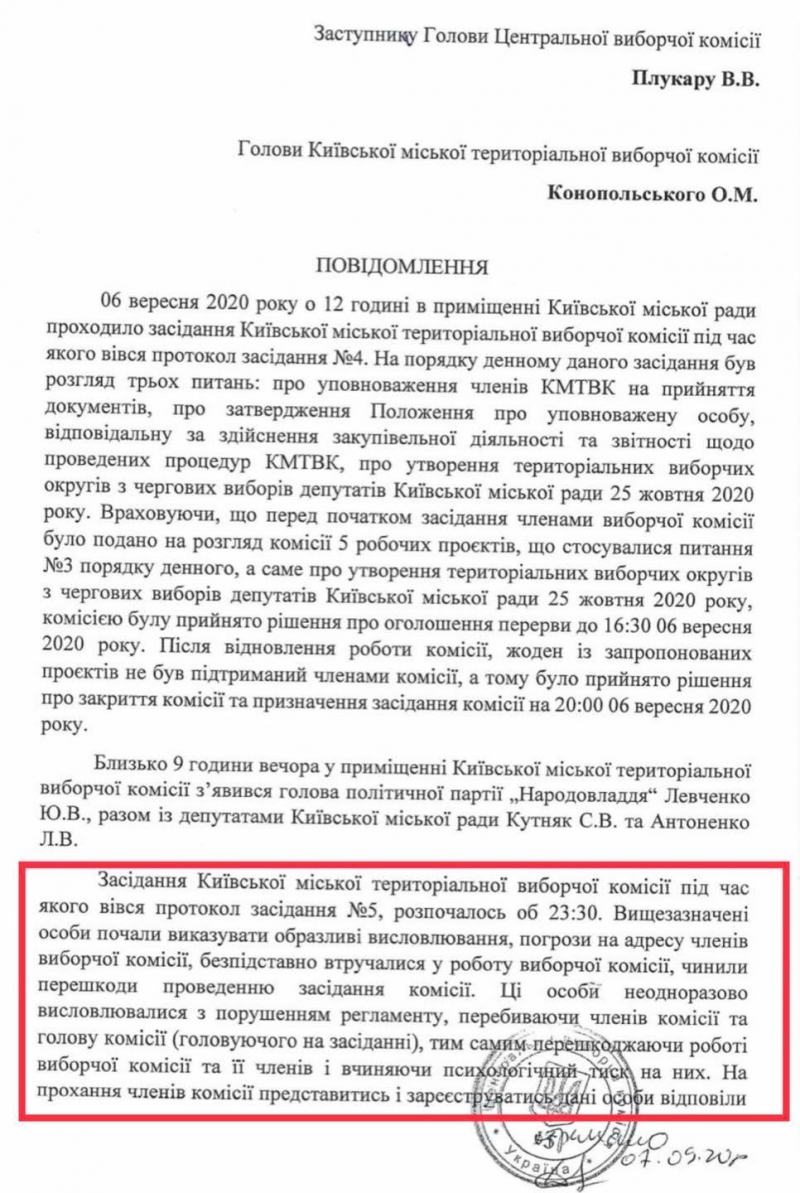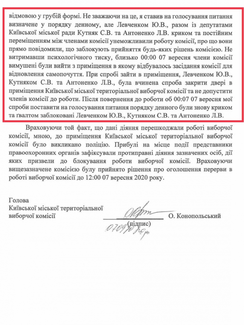 У Повідомленні, котре Левченко прикріпив до свого допису, пан Конопольський надає пояснення про хід засідання, яке відбулося 06.09.2020 та 07.09.2020. У Повідомленні йдеться, що 06.09.2020 Київська міська територіальна виборча комісія після довгої перерви, розпочала своє засідання о 23:30. На засіданні, за словами голови ТВК, були поставлені на голосування питання порядку денного, але через перешкоджання роботи комісії Юрієм Левченком та іншими депутатами Київради члени комісії були вимушені покинути зал засідання, через «психологічний тиск на них». Голова зазначив, що після того, коли комісія повернулася назад до залу, де мало продовжуватись засідання, Юрій Левченко разом з іншими депутати намагались зачинити двері та не допустити членів комісії до роботи. Попри це, засідання продовжилось вже об 00:07. Голова поставив на голосування питання порядку денного, але через повторні спроби Юрія Левченка перешкодити проведенню засідання, комісія прийняла рішення про оголошення перерви в роботі до 12:00 07.09.2020.