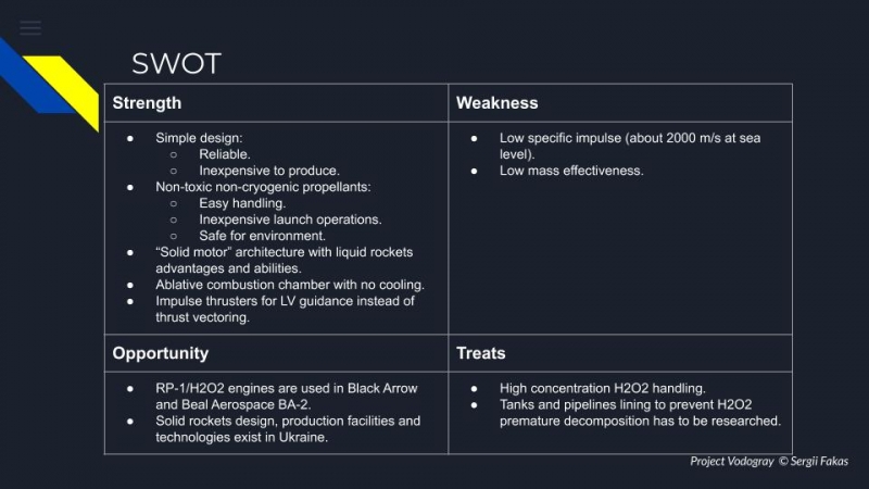 Звичайно, що це дуже приблизний розрахунок. Звичайно в ньому і в моїх припущеннях можуть бути помилки, наприклад, конструкція вийде таки важчою. Звичайно, я не знаю навіть приблизної вартості виготовлення композитних баків за технологією РТ-23. І навіть якщо все ОК, то залишаються питання теплового розрахунку камери, джерела тиску для наддуву баків, проблема розкладання висококонцентрованого перекису при перекачуванні та зберіганні. Але усе це — звичні фактори ризику при будь якій розробці. І спосіб їх прибрати — провести більш детальне проектування, до якого було би дуже доречно долучити матеріали, які залишилися в Beal Aerospace.