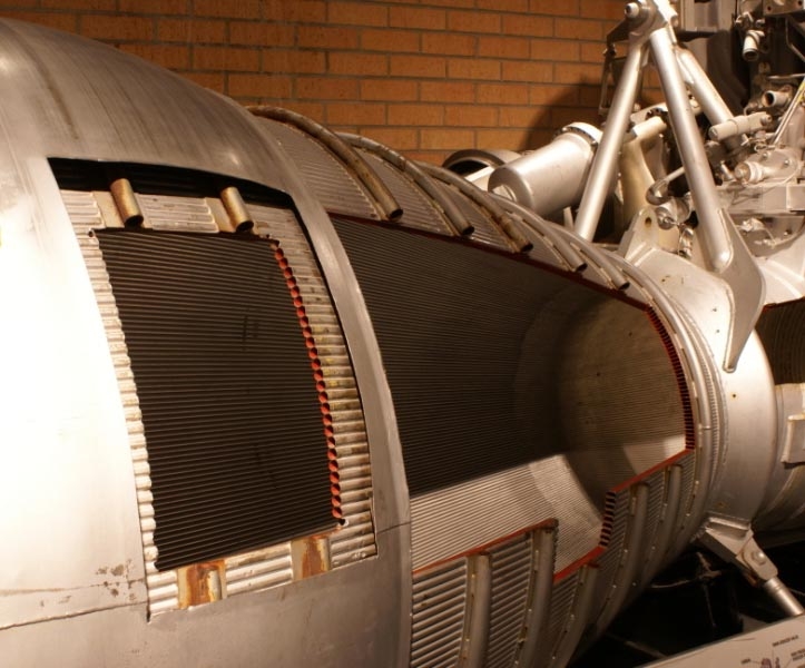 Ні, КЗ РРД роблять не з вольфраму. І головна проблема не в температурі газів усередині, а в теплопотоці від газу в стінку камери. Тобто, якщо ми зможемо організувати відведення цього тепла, то ніякі тугоплавкі метали нам не потрібні, і все буде добре. КЗ сучасного РРД охолоджується одним із компонентів пального, зазвичай паливом, бо окислювач занадто агресивний. Цей компонент проходить каналами охолодження камери і забезпечує відвід тепла від її стінок. Такий тип охолодження називається проточним. Ось, наприклад, препарована КЗ американського H-1 із першого ступеню РН Saturn-IB