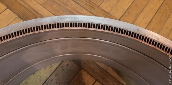 На цьому знімку добре видно, що камера набрана з трубочок(!), які спаяні між собою високотемпературним припоєм. У СРСР традиційно використовували трохи інакшу конструкцію КЗ — у внутрішній стінці фрезерували канали охолодження і зверху припаювали зовнішню стінку. Таким чином, на відміну від трубочок, можна використовувати різні метали: для внутрішньої стінки — бронзу з хорошою теплопровідністю, а для зовнішньої — міцну сталь.