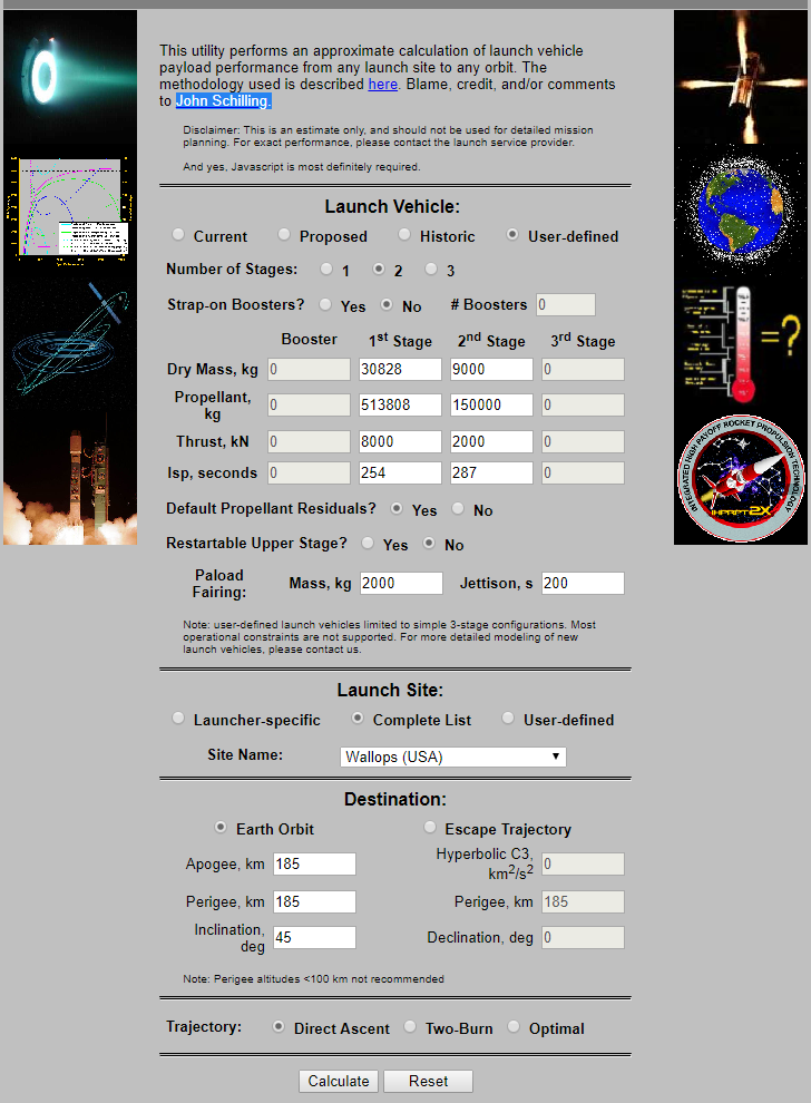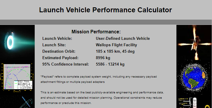 Зеніт мені був потрібен для того, щоб зрозуміти співвідношення сухої маси ступеню до маси пального. А орієнтовне значення цього співвідношення мені потрібно було для того, щоб прорахувати, яке корисне навантаження зможе вивести Шрек із космодрому на Wallops Island на кругову орбіту з нахилом 45°. А зробити це можна за допомогою Launch Vehicle Performance Calculator від John Schilling.