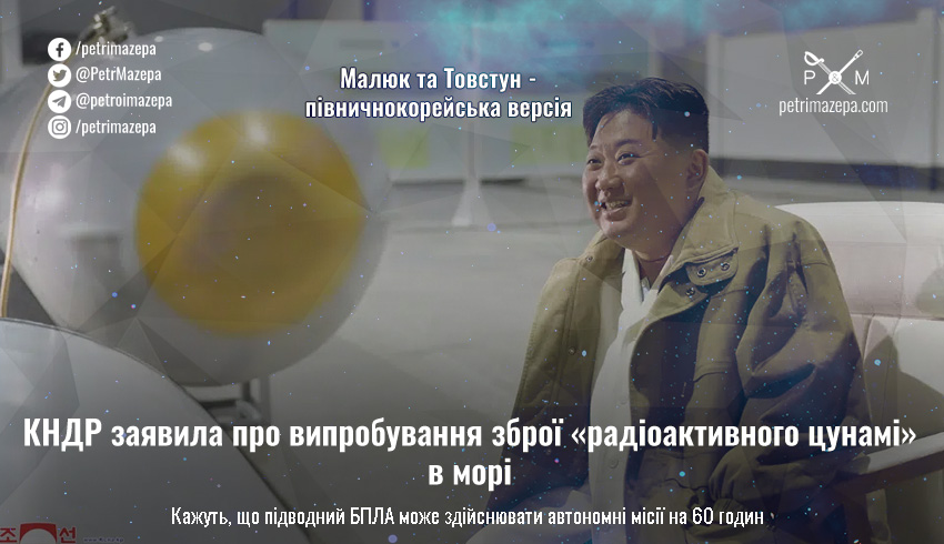 КНДР заявила, що провела випробування підводного безпілотника з ядерною зброєю. Його призначення — створення гігантського «радіоактивного цунамі», яке знищить військово-морські ударні угруповання і порти.