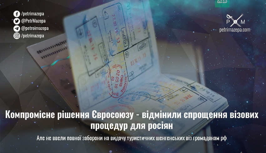 На нараді голів МЗС країн Євросоюзу у Празі вирішено призупинити всі чинні угоди про спрощення візових процедур для громадян РФ. Проте не запроваджено повної заборони на видачу туристичних шенгенських віз громадянам рф. По суті припинення угод з росією про спрощений режим надання віз означає, що громадяни РФ зможуть і надалі отримувати шенгенські туристичні візи, проте їм доведеться у загальному випадку довше чекати, більше платити та збирати більше документів.