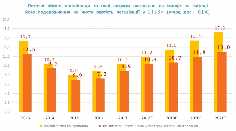 Різниця ж між поточними обсягами контрабанди та новими витратами населення на імпорт у разі «обілення» контрабанди (за вирахуванням надходжень до бюджету) і є ключовим негативним ефектом контрабанди — надлишковим відпливом валюти. 2018 року він становив 4,7 млрд доларів, що на 0,5 млрд більше, ніж торік (прогноз виконаний за інших рівних).