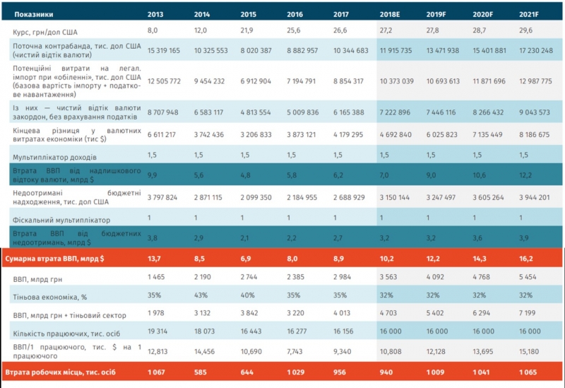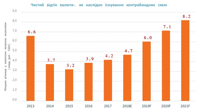 У сумі прямі та непрямі втрати для економіки від контрабандних схем імпорту 2018-го становили 10,2 млрд доларів, із яких 7,0 млрд (68,6%) — через надлишковий відплив валюти, а 3,2 млрд (31,3%) — через утрати бюджету.