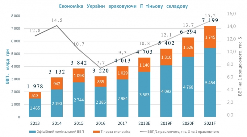 При цьому офіційне значення ВВП не коректне для розрахунку доданої вартості, яку генерує один зайнятий в Україні, адже не враховує тіньову складову, що бере повноцінну участь у створенні робочих місць усередині країни.