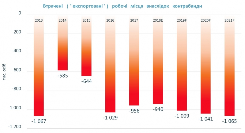 Відповідно, якщо розділити розраховану суму втрат ВВП через існування контрабандних схем на отримані значення ВВП / 1 працюючого, то отримаємо кількість робочих місць, які фактично були «експортовані» до країн-постачальників контрабандної продукції в Україну. Так, упродовж останніх 6 років Україна щорічно втрачала майже 870 тис. робочих місць. 201 ж року цей показник становив 956 тис., а 2018-го — 940 тис. Прогноз, як і в усіх прикладах вище, невтішний, уже сьогодні ми втрачаємо понад 1 мільйон робочих місць у країні через контрабанду.