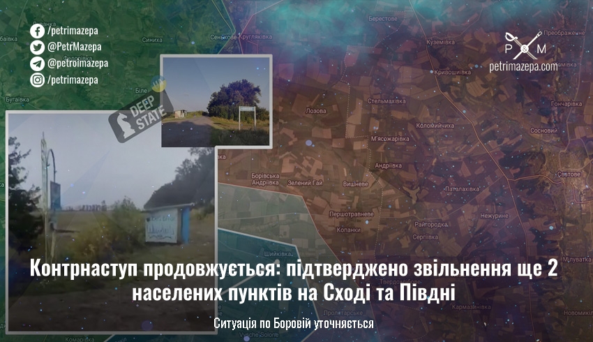 Також підтверджується звільнення Шийківки на Харківщині — вона знаходиться неподалік від Борової. Про звільнення Борової також вже були повідомлення, проте Deep State підкреслює, що інформація все ще на уточненні.