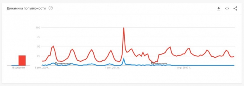 Однак такі графіки поодинці порівнюють дані лише в межах одного запиту. Якщо ж ми побудуємо в одній системі координат графіки одразу за обома запитами, то картинка стане ще виразнішою.